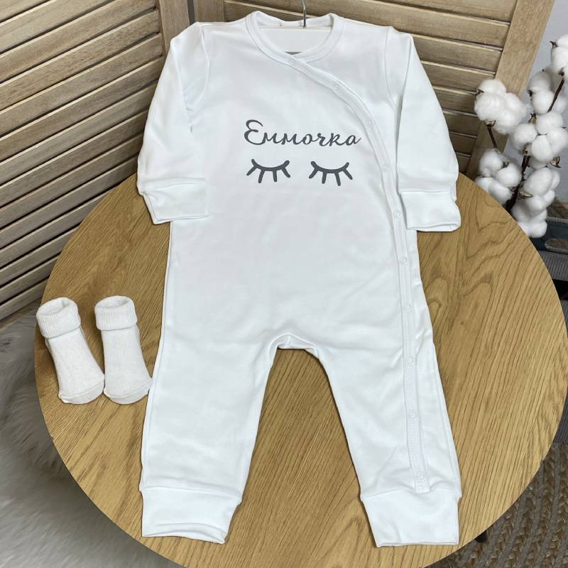 Дизайн: сліп для новонародженої дівчинки з милим принтом у вигляді вій та іменем дитини; індивідуальне нанесення імені