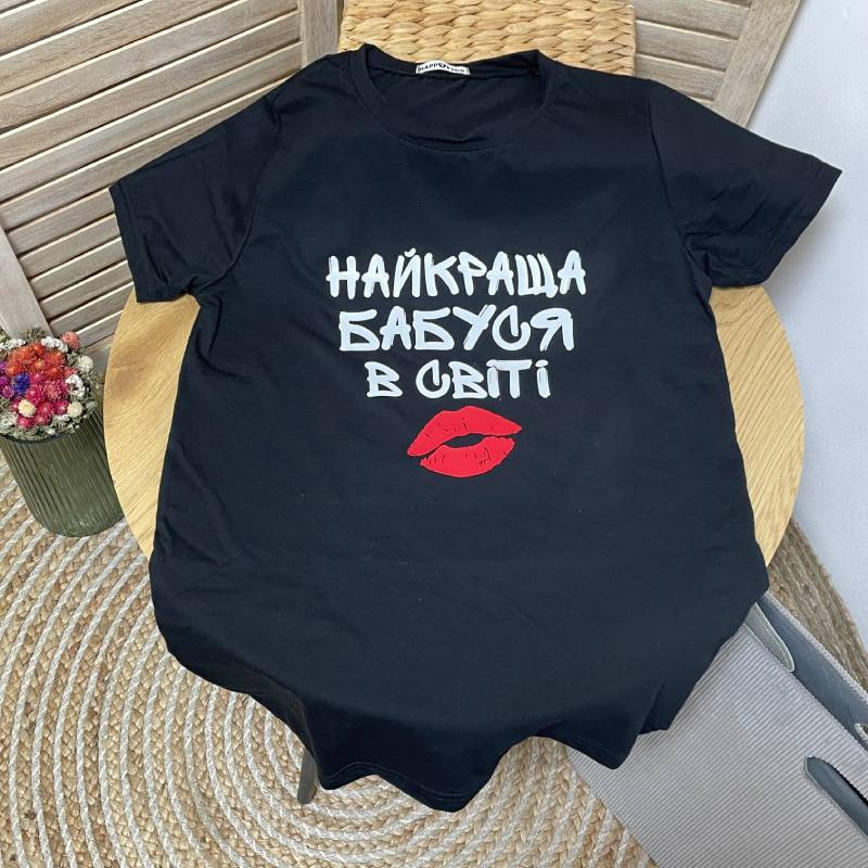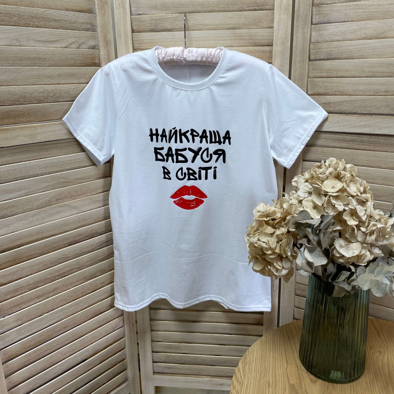Базова однотонна жіноча футболка з оригінальним написом про бабусю - гарна ідея для подарунку бабусі, сюрприз для сімейної фотосесії, родинних свят.