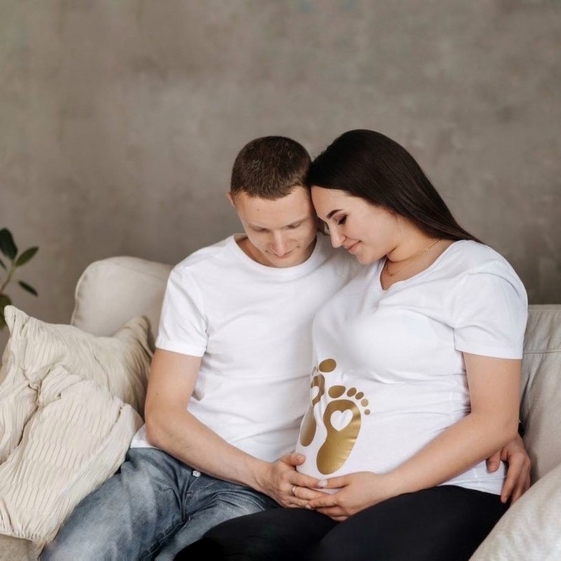 Базова однотонна жіноча футболка для вагітної фотосесії з пузіком з оригінальним принтом - гарна ідея для подарунку подрузі, для сімейної фотосесії, прогулянок.