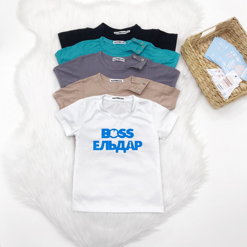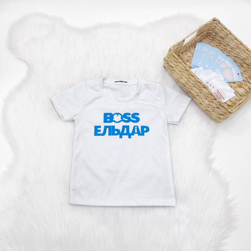 Нарядна футболка з написом для хлопчика в стилі улюбленого мультфільму Бос молокосос. Іменний напис на футболці підійде на перший день народження, чудове вбрання на рік і будь-яке свято.