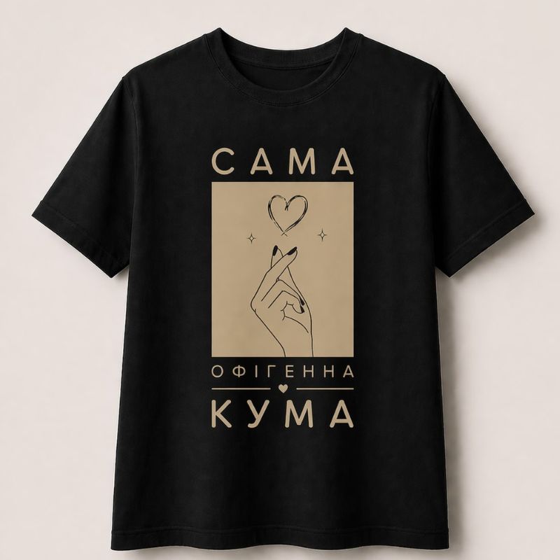 Дизайн: футболка з написом у стильному виконанні — «Сама офігенна кума» або «самий офігенний кум», сучасний принт, що привертає увагу