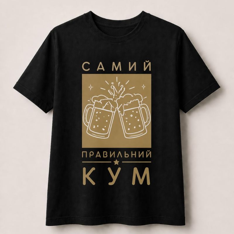 Дизайн: однотонна футболка з контрастним написом «Самий правильний кум» або «сама правильна кума»; можливе виконання у різних кольорах.
