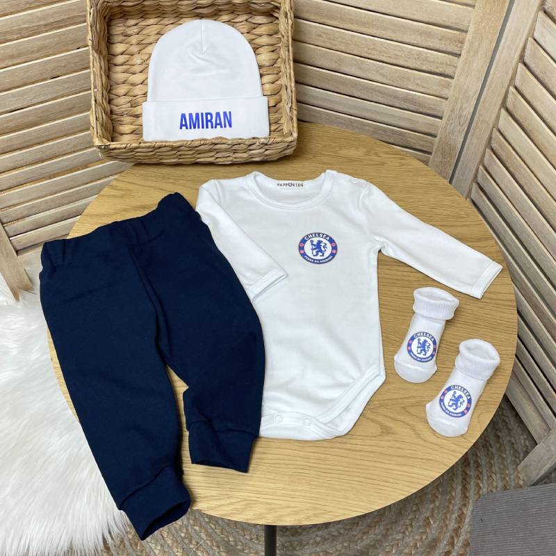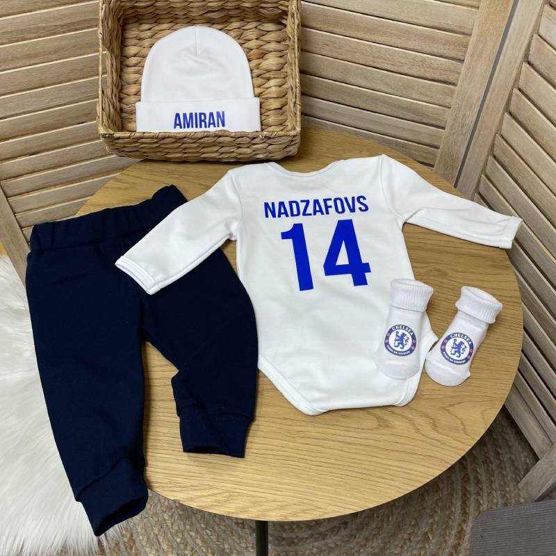 Іменний комплект для малюка у футбольному стилі з логотипом команди та номером гравця — це стильне рішення для маленького фаната. Дитячий футбольний комплект з логотипом улюбленої команди стане чудовим подарунком новонародженому, ідеєю для фотосесії або виписки з пологового. Персоналізація (ім’я, номер гравця) робить комплект унікальним та особливим.
