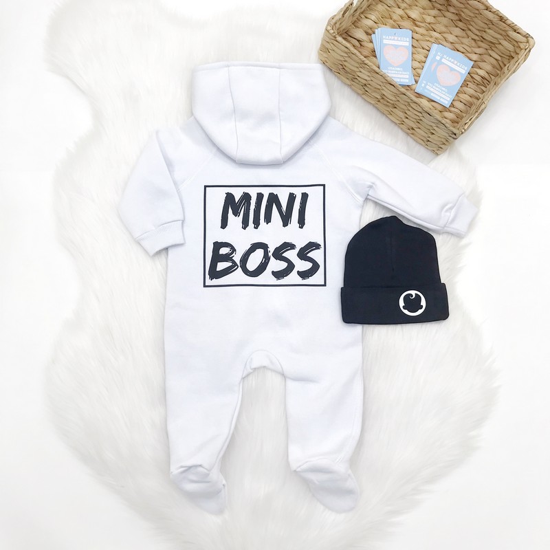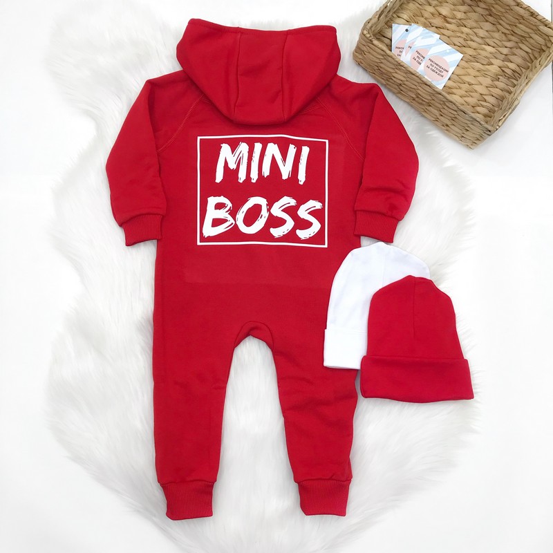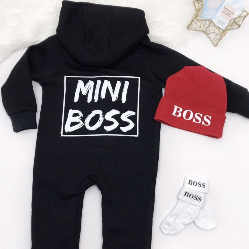 Дитячий комбінезон-ромпер для новонароджених з оригінальним принтом mini boss. Стильний принт і прикольний напис на одягу для новонародженого.