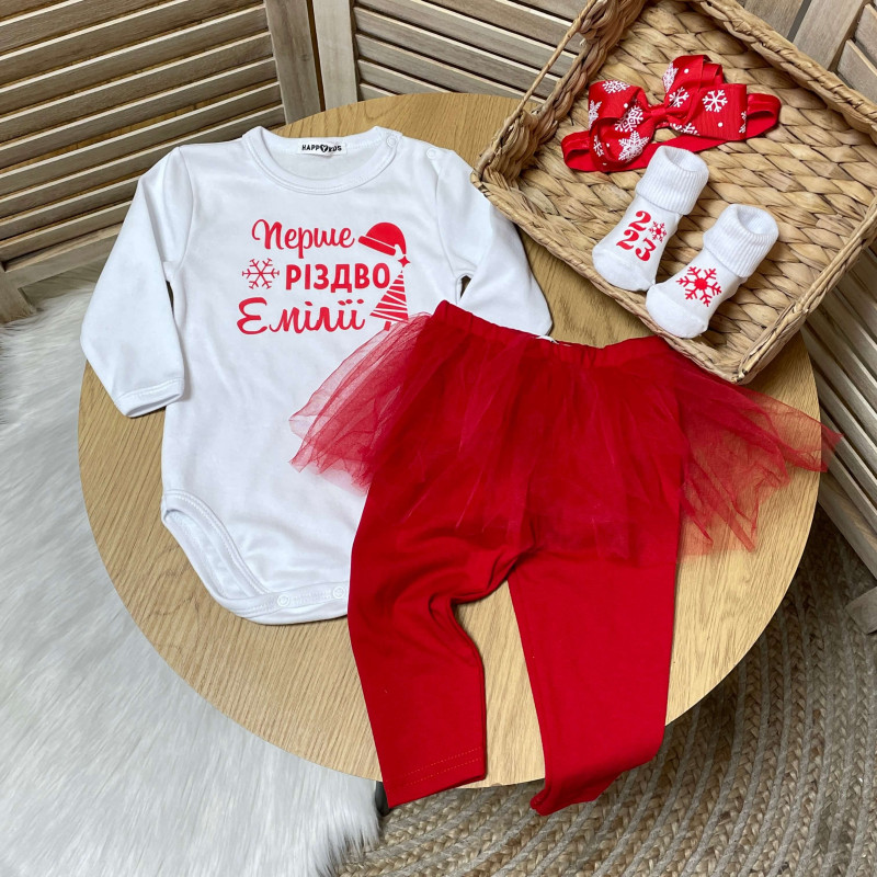 Комплект з боді для дівчинки з іменнем дитини і написом "Перше Різдво" - це найкращий подарунок для вашого маленького скарбу на свята.