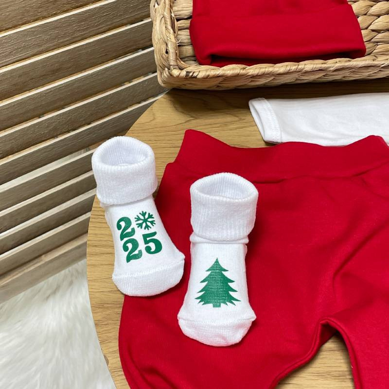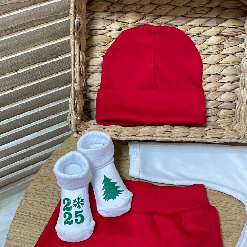 В комлекті: боді з написом Мій перший Новий рік і зображення змії, червоні штанці, червона шапочка з відворотом та шкарпетки 2025/ялинка.