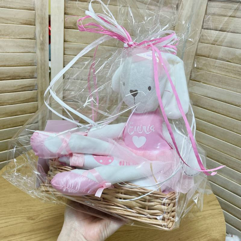 - Комплектація: В комплект входить боді, лосини зі спідничкою, бантик, зайка з іменем дитини.