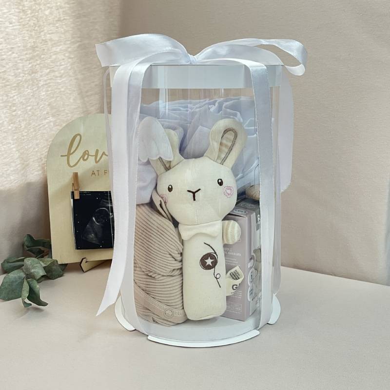 Подарунковий набір містить необхідні речі для новонародженого. Упаковано в циліндричну прозору коробку з білим атласним бантом.