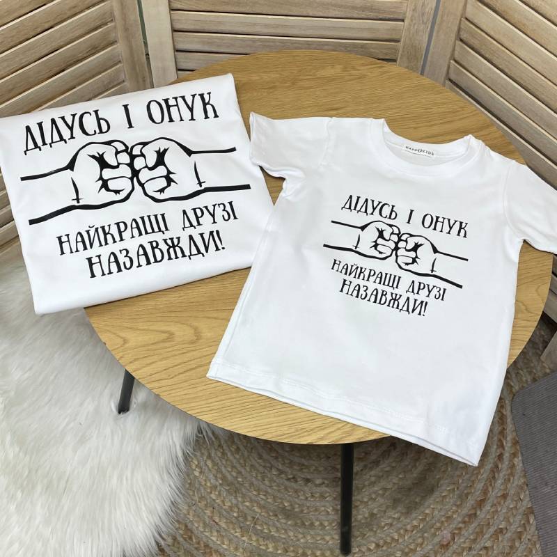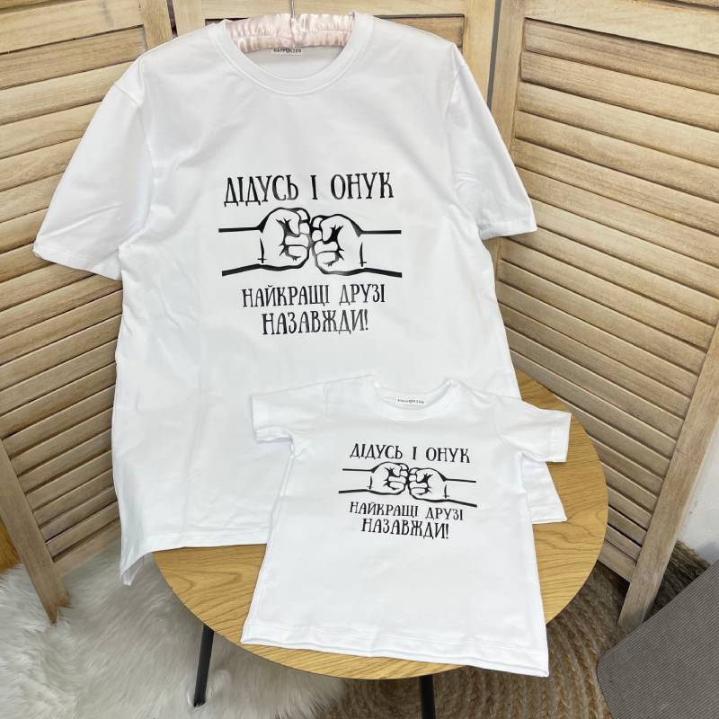 Сімейна любов у кожній деталі! Представляємо унікальний набір для дідуся та онука – стильна футболка для дорослого та миле боді для малюка з написом "Найкращі друзі назавжди". Ідеальний подарунок, що об'єднує покоління й дарує незабутні емоції.