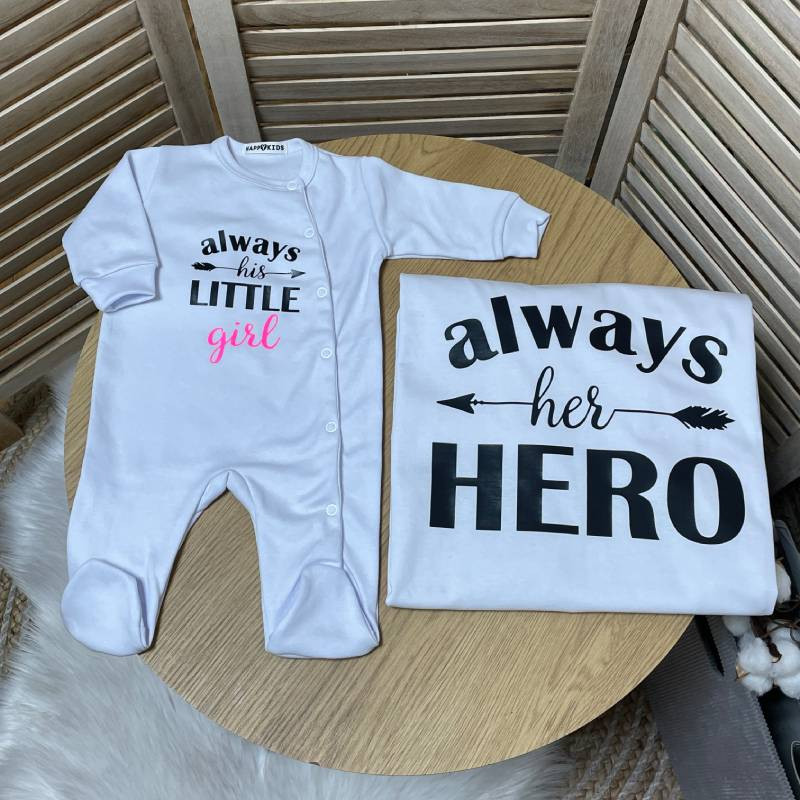 Це доросла чоловіча футболка для татка з написом «Always her Hero» і дитячий чоловічок для новонародженої дівчинки «Always his little girl. Які виглядають дуже органічно і чудово доповнюють один одного.