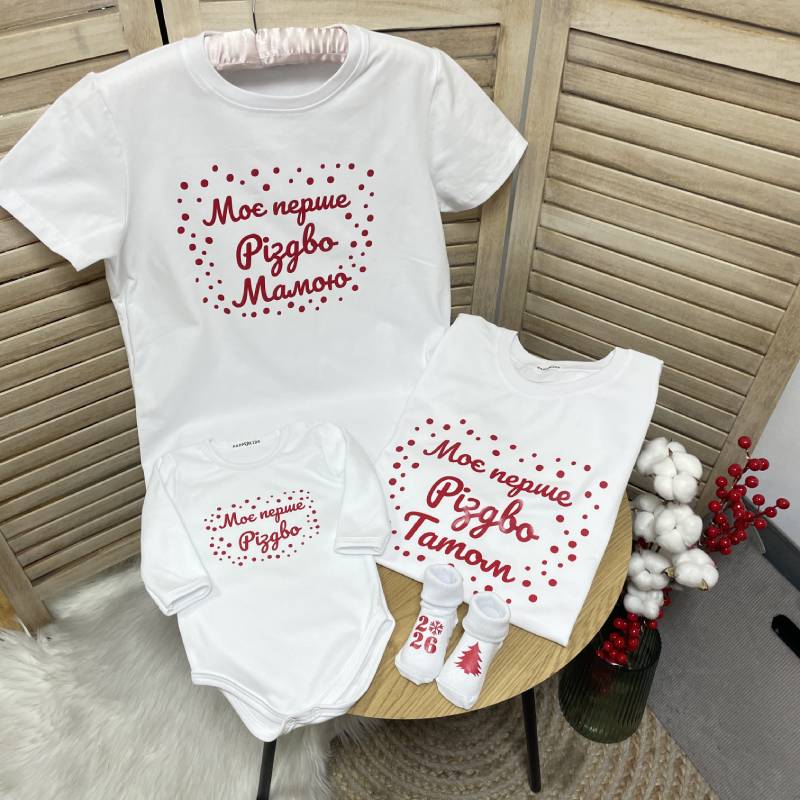 Новорічні футболки в одному стилі з оригінальним написом найкращий вибір для всієї родини ідеально підходить одяг на перший Новий рік дитини. Також чудова ідея для подарунку, сімейної фотосессії або новорічного родинного свята.