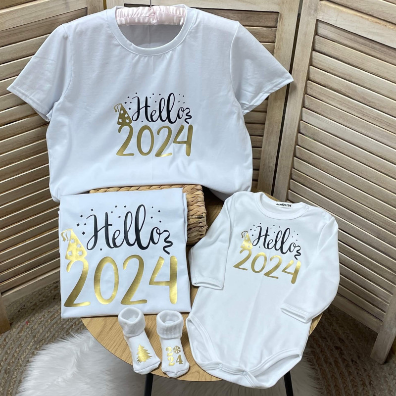 Новорічні футболки в одному стилі з оригінальним написом найкращий вибір для всієї родини - ідеально підходять як одяг на перший Новий рік дитини. Також чудова ідея для подарунку, сімейної фотосессії або новорічного родинного свята.