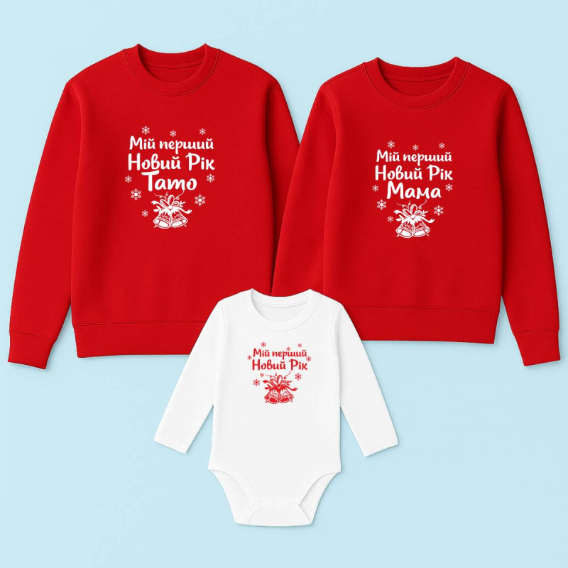 Новорічний набір одягу зі світшотів та боді з написом "Перший Новий рік з мамою/татом" — це стильний, святковий і зворушливий комплект для родини, яка вперше святкує Новий рік разом із малюком. Такий family look створює особливу атмосферу тепла, радості та любові, ідеально підходить для фотосесії, святкової вечірки або як подарунок для молодих батьків.