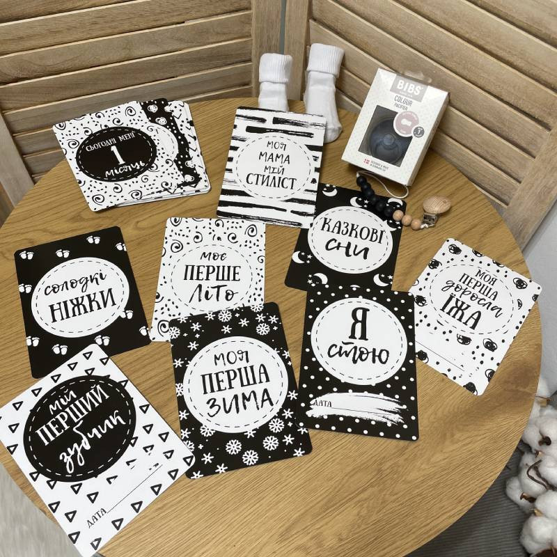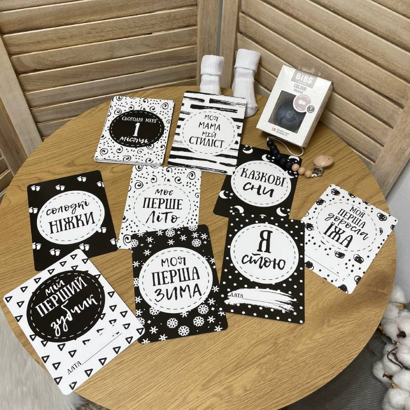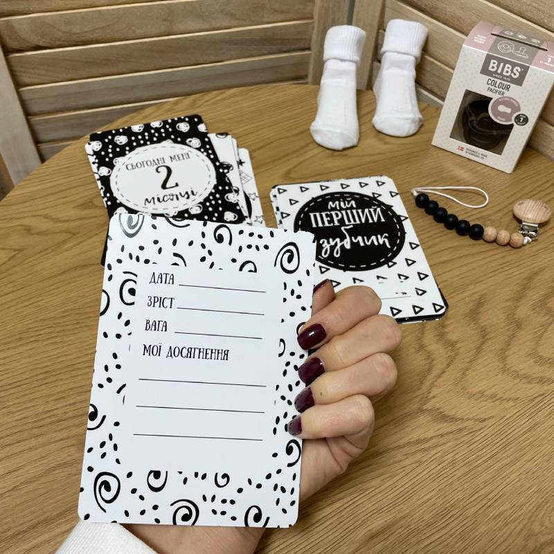 Перші місяці життя малюка сповнені унікальних моментів, які хочеться зберегти назавжди. Подарунковий набір для новонародженого з чорно-білими картками для фото допоможе красиво зафіксувати найважливіші події в житті малюка та створити зворушливий фотозвіт з його перших днів.