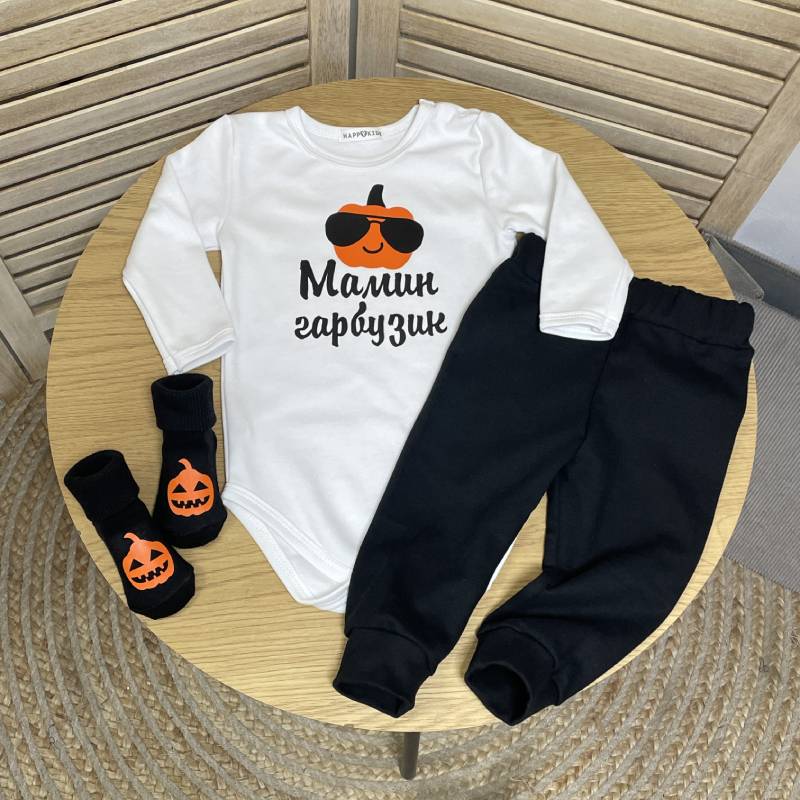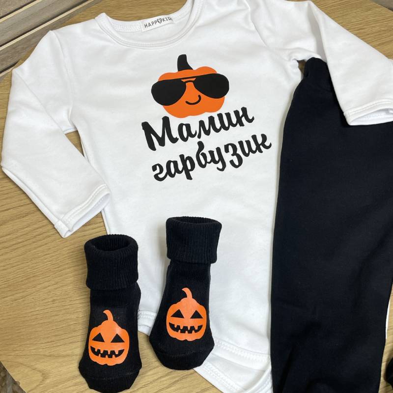 - Дизайн: боди с тыквой и надписью «Мамина тыковка»