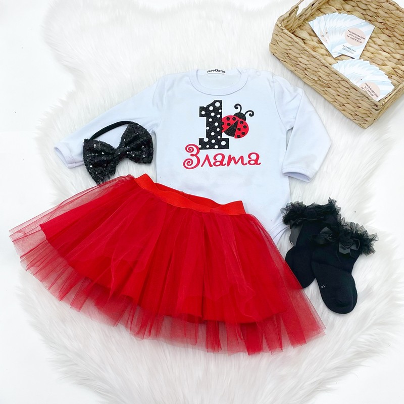 Яркий нарядный боди с цифрой единичкой рисунком божья коровка на первый день рождения девочки.