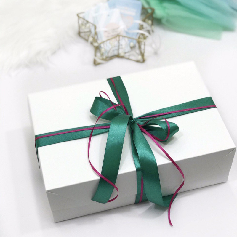 Обратите внимание, что цвет лент упаковки подбирается под цвет заказа. Размер коробки также корректируется под объем товаров. Таким образом упаковка гармонично дополняет товар по цвету и размеру.
