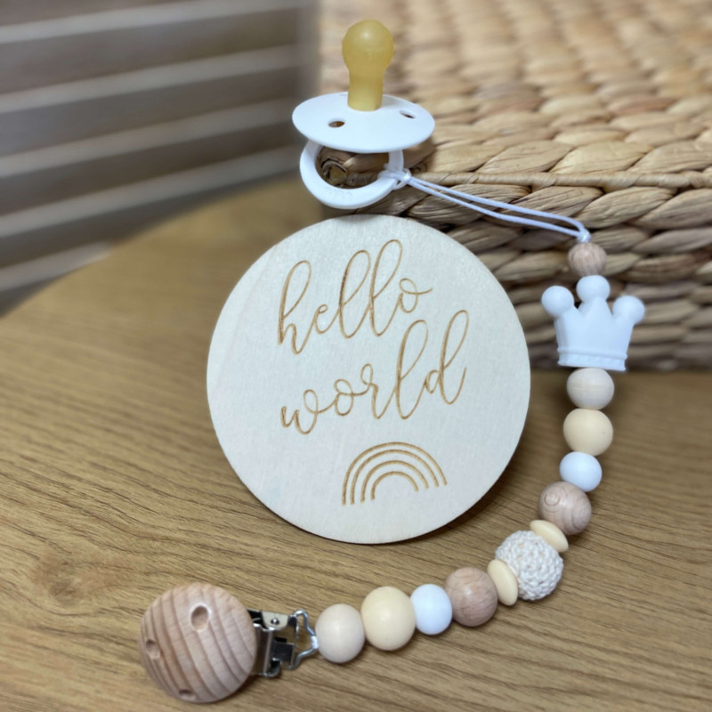 В комплекте также деревянная карточка с надписью "Hello world", которая станет отличным аксессуаром для первых домашних фотосессий новорожденного малыша.