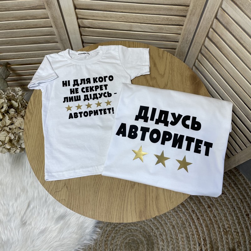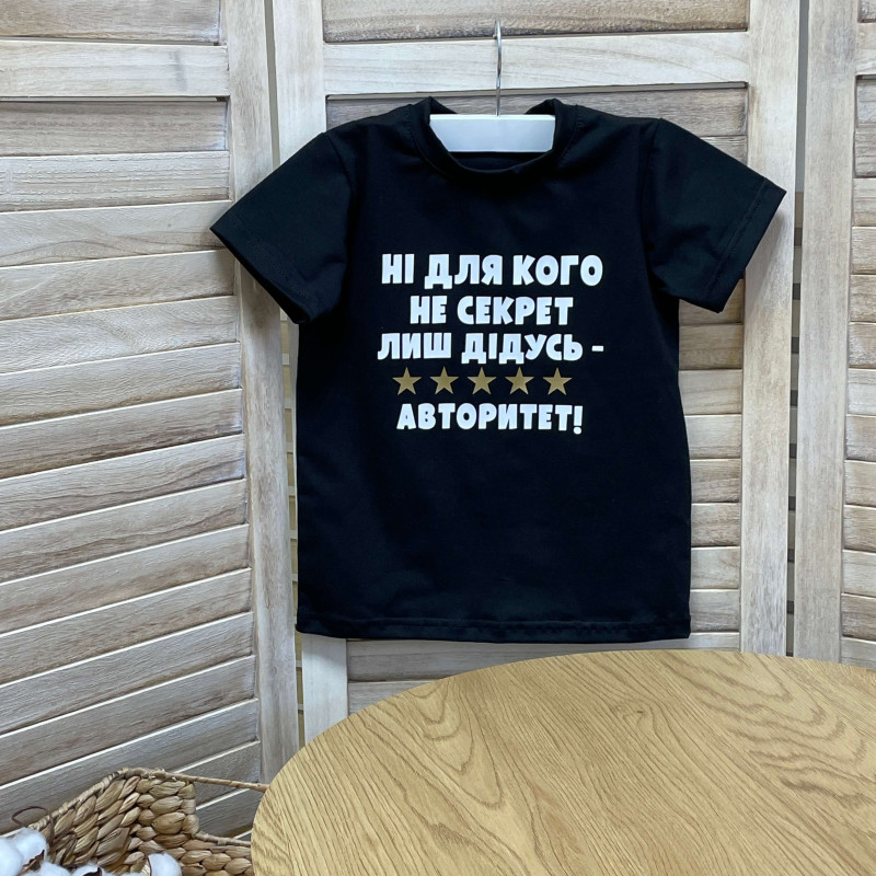 Базовая однотонная детская футболка с оригинальной надписью "Для меня авторитет только мой любимый дед"– хорошая идея для подарка тату, для семейной фотосессии, семейных праздников.