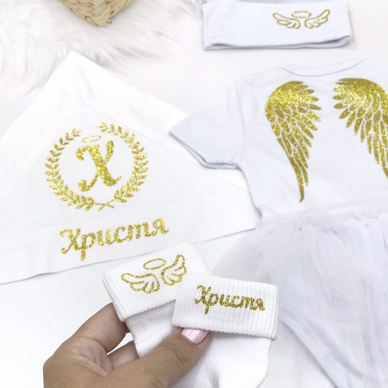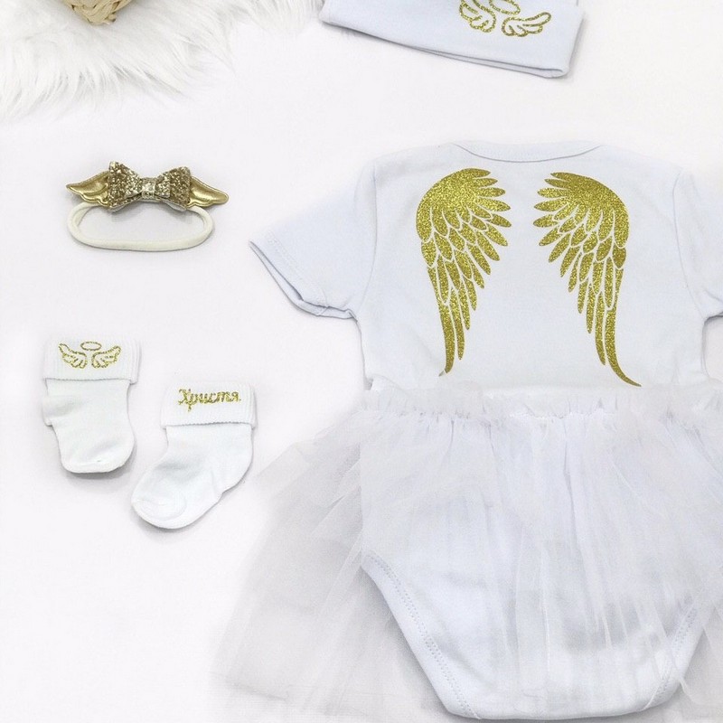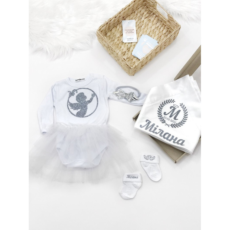 В наборе: боди с фатиновой юбочкой, шапочка, именные носочки