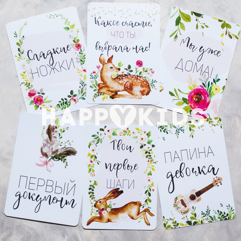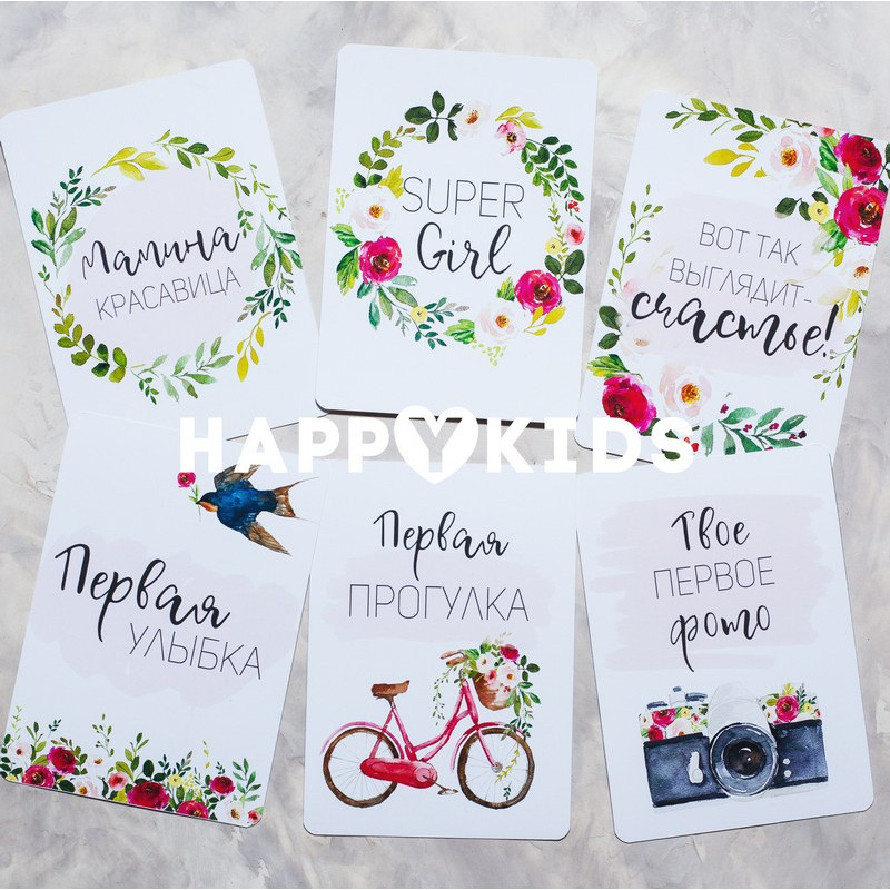 -6 плотных двусторонних картонных открыток с самыми незабываемыми и прекрасными моментами первого года жизни ребёнка.