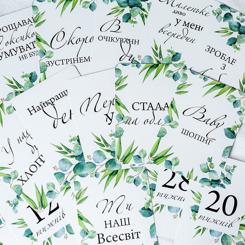 - 20 плотных картонных двусторонних открыток с самыми незабываемыми моментами всего срока беременности