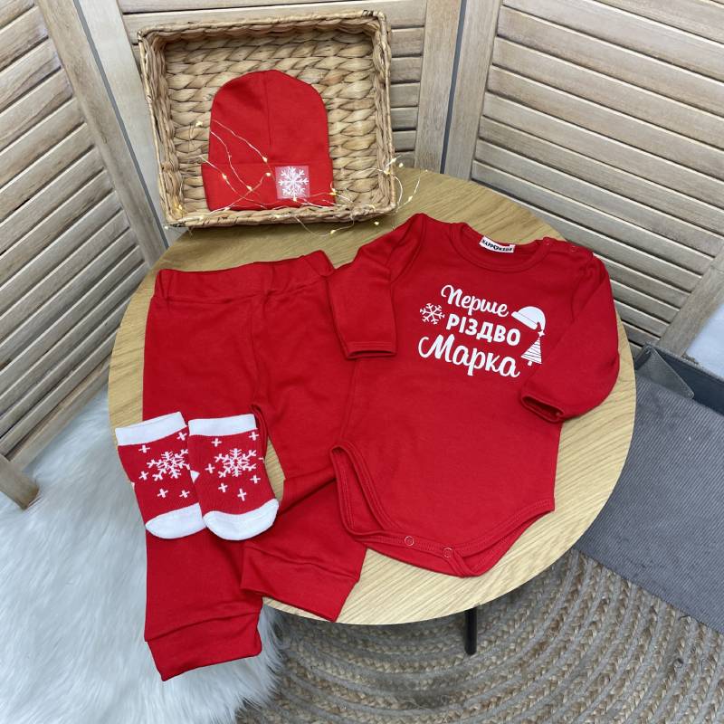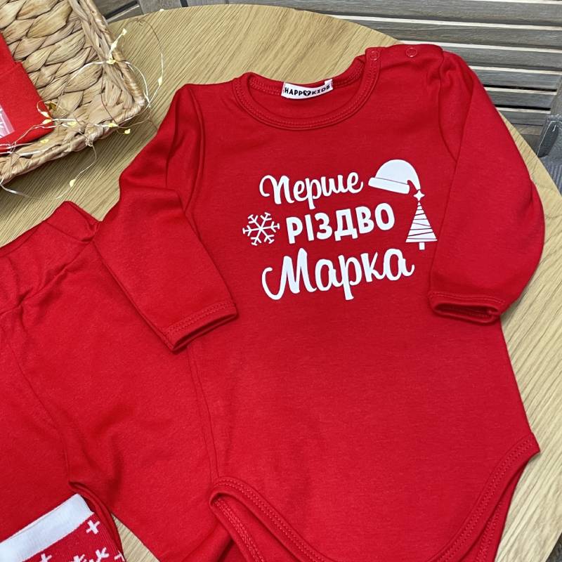 - Дизайн: праздничный новогодний принт с надписью "Первое Рождество" и возможностью добавить имя малыша