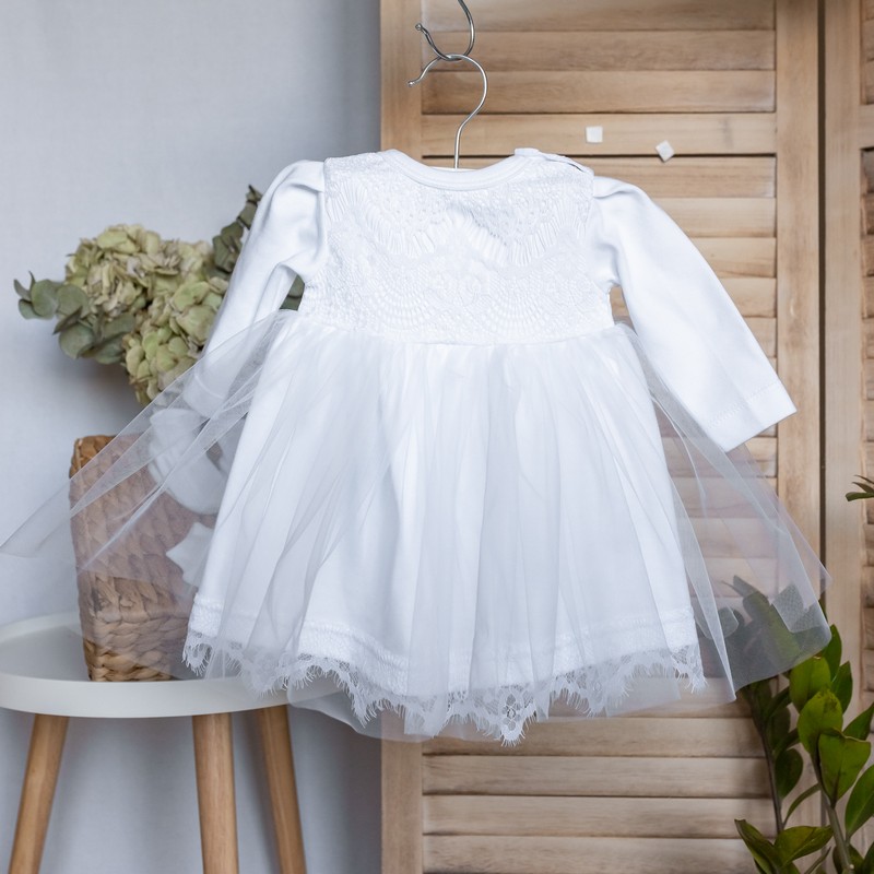 Красивый нарядный комплект для девочки новорожденной состоит из 5 позиций: Нежной платье с мягким кружевом, милые лосинки, комфортная шапочка, антицарапки на ручки, топики на ножки.