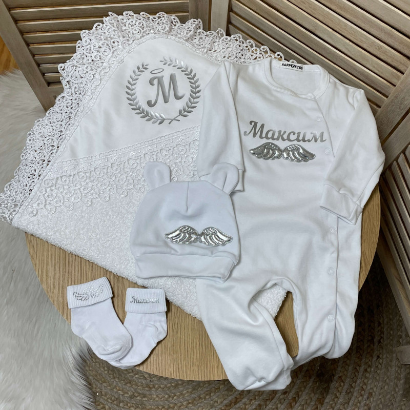 Этот крестильный набор именной, хорош как никакой другой во всех отношениях. Чего только стоит то, сколько предметов входит в комплект. Это комфортный человечек, теплые носочки, шапочка, и конечно же крыжма. При этом, каждый из них является именным. И мы можем предложить вам нанести на него любую надпись. Начиная от имени, и заканчивая поздравительными словами. Поэтому, такой крестильный набор способен не просто оправдать, но и превзойти все ваши ожидания.