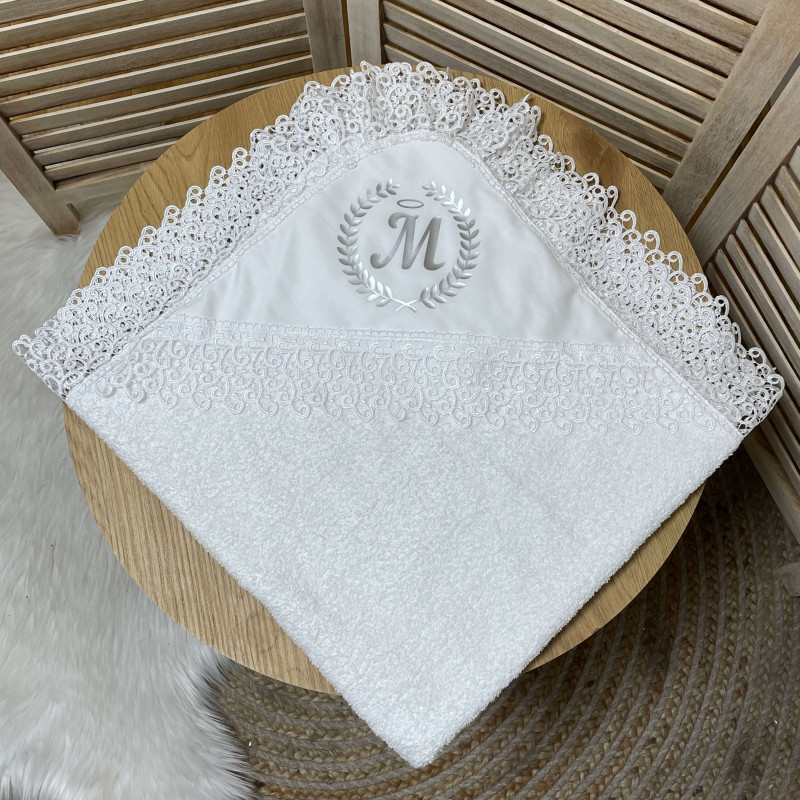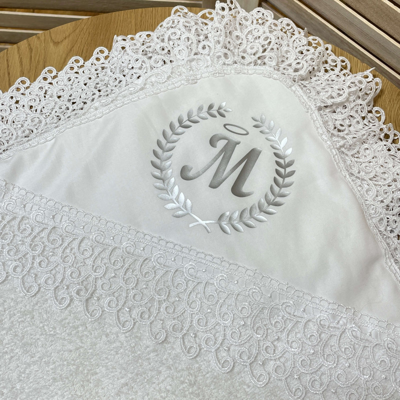 - Махровая крестца с кружевом по нанесению инициалов ребенка и дате.