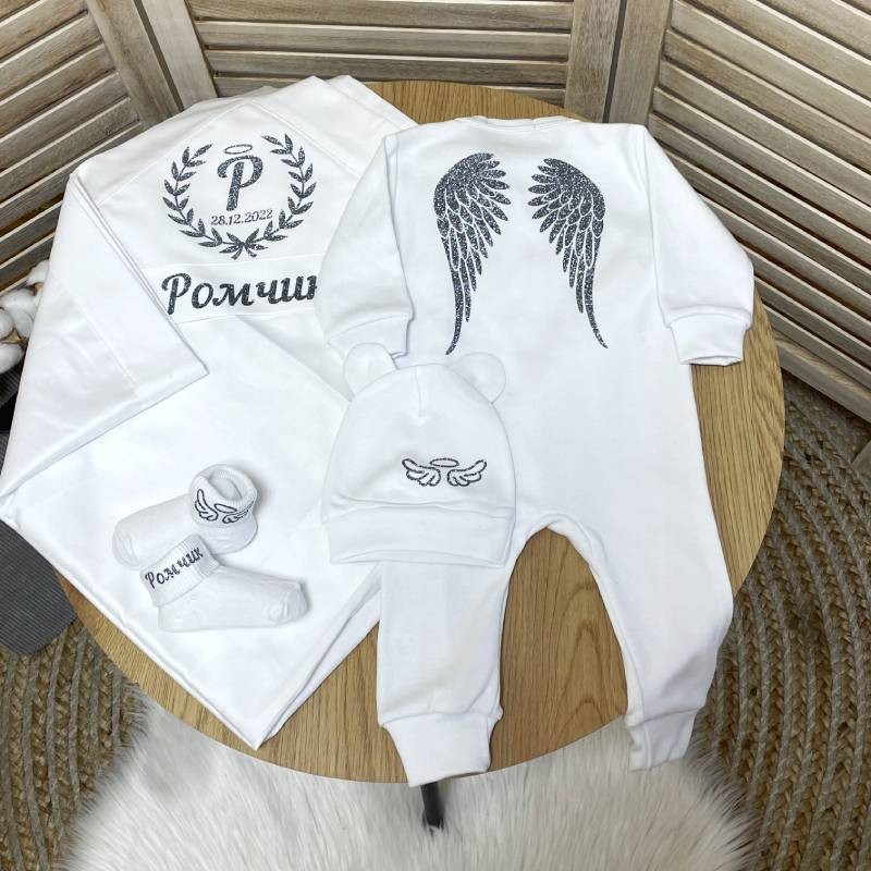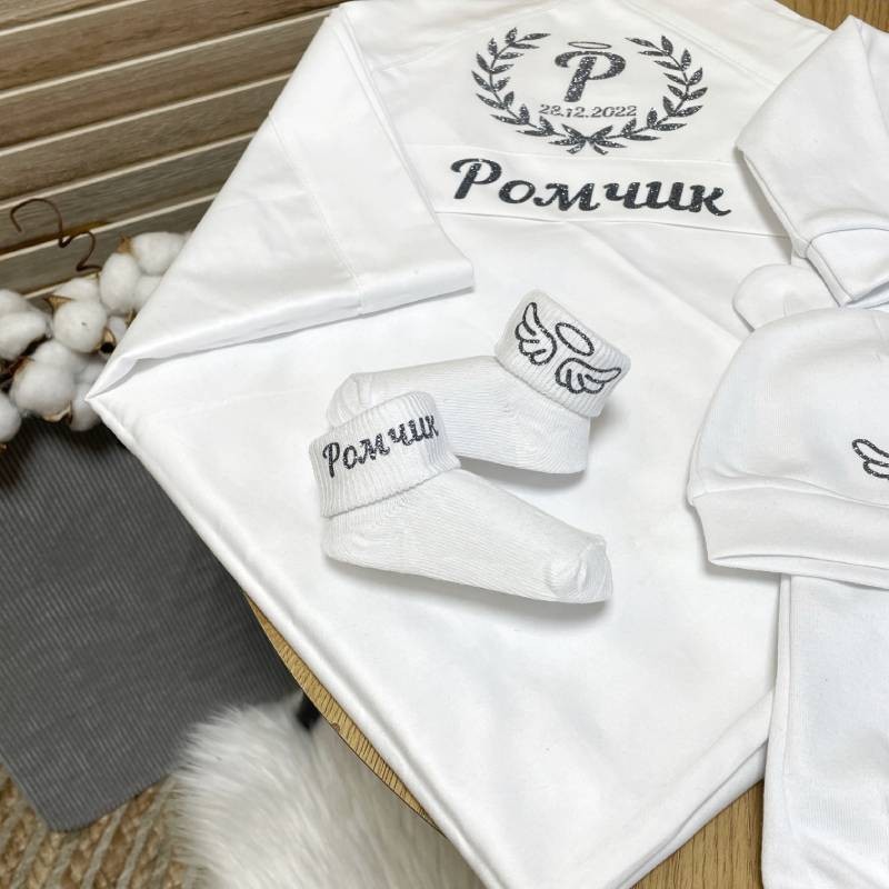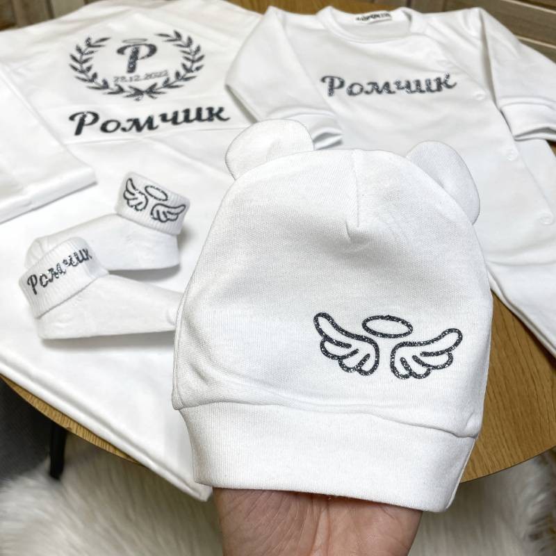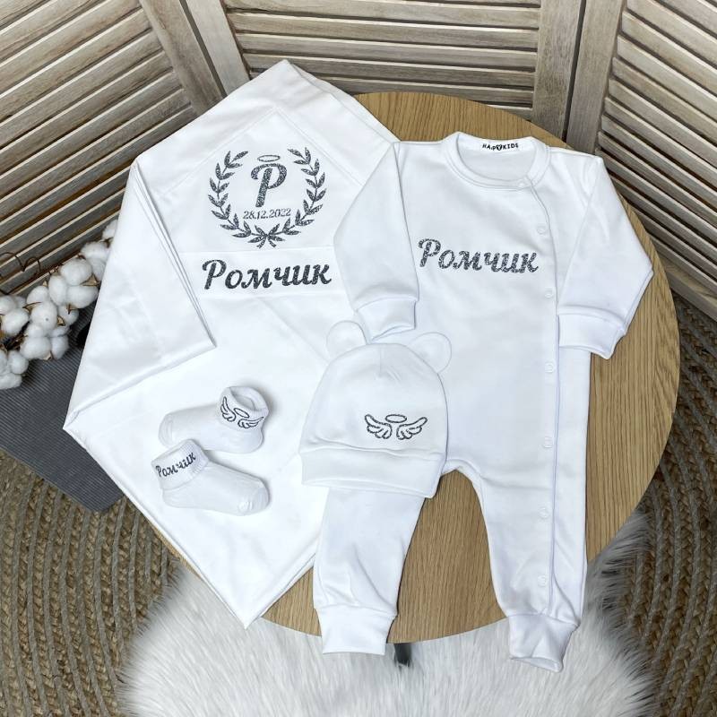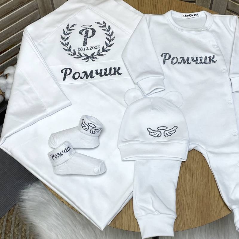- Индивидуальный дизайн – сделайте комплект уникальным: Вы можете добавить имя ребенка, дату крещения или пожелания.