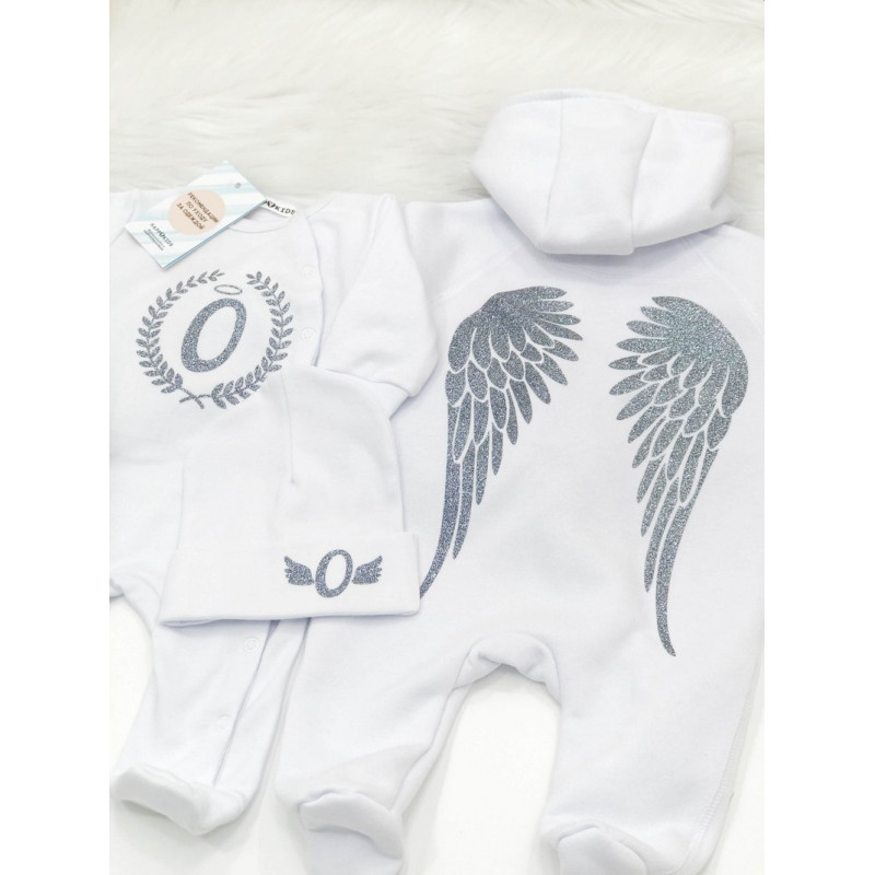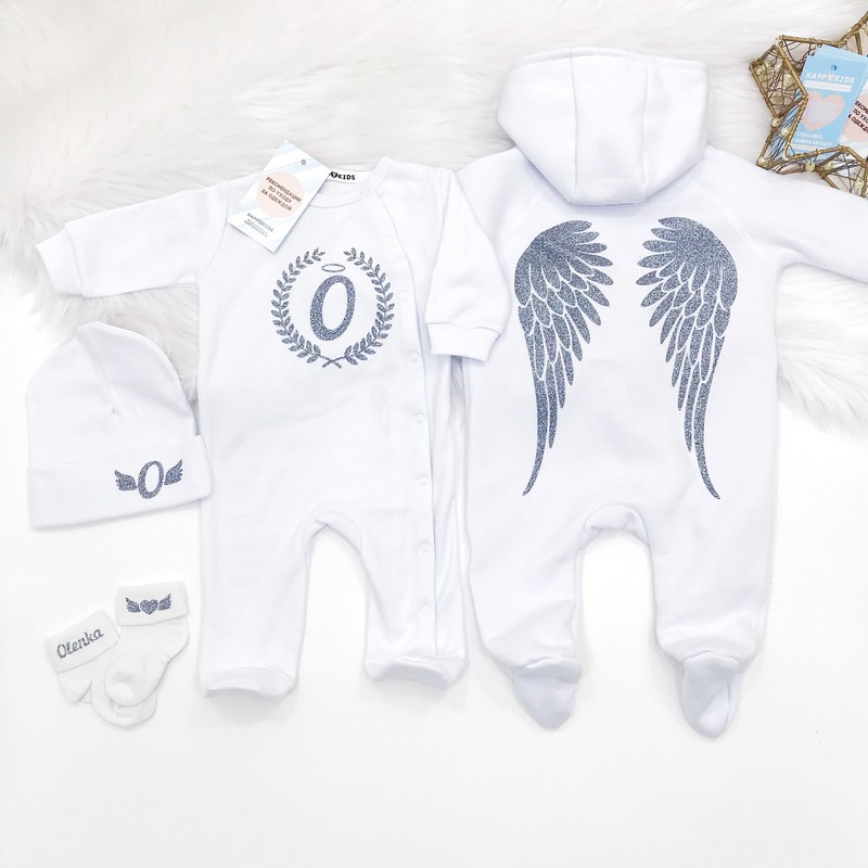 Такой набор как этот, несомненно будет к лицу вашему малышу. В котором, он будет выглядеть как настоящий ангел. Осталось, только купить набор детский с инициалами и крыльцами.