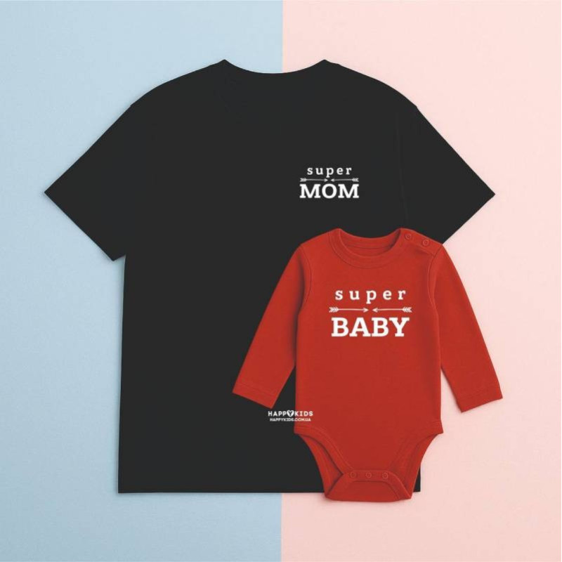 - Дизайн: минималистичный принт "Super mom" на футболке для мамы и "Super baby" на бодике.