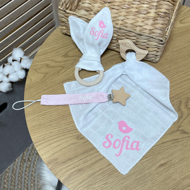 Наш именной грызунок может быть персонализирован с именем вашего ребенка, что делает его отличным подарком на рождение или крестины. Кроме того, в комплекте с грызунцем идет деревянная птичка с платком муслин, который может быть использован как дополнительный грызунок или как обычная игрушка.