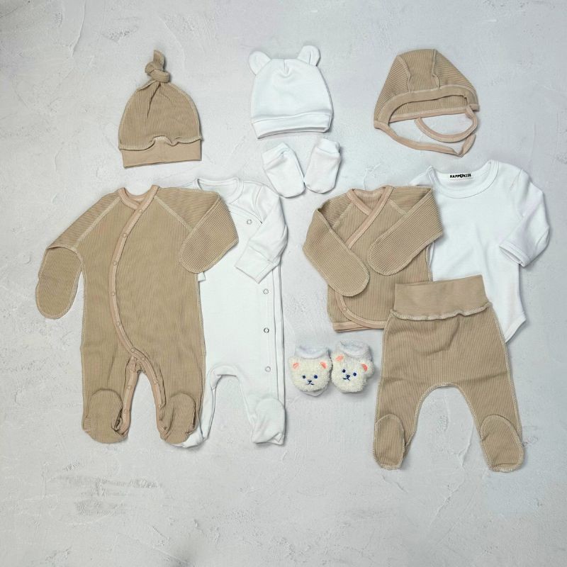 Набор одежды для новорожденных в бежево-белых оттенках – это прекрасное решение для ежедневного ношения, торжественных событий или стильного подарка для будущих родителей.