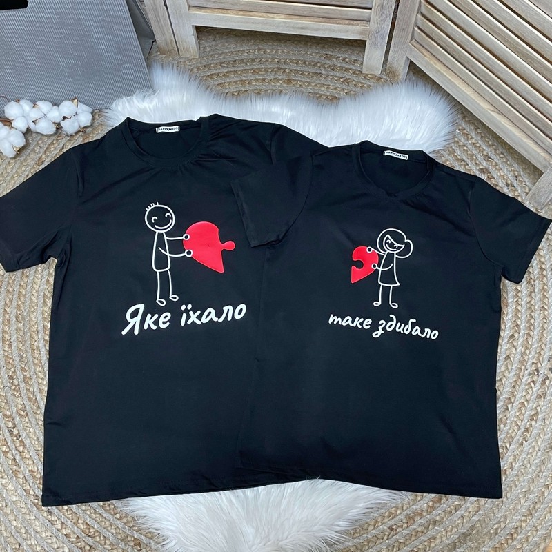 В комплекте - мужская и женская футболка в белом или черном цвете.