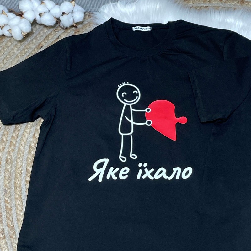 Парные футболки "Яке їхало таке здибало" изготовлены из натурального хлопка. С 5% добавлением эластана, позволяющим изделию держать форму, и прекрасно сидеть по фигуре.