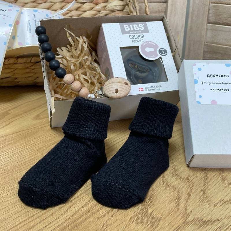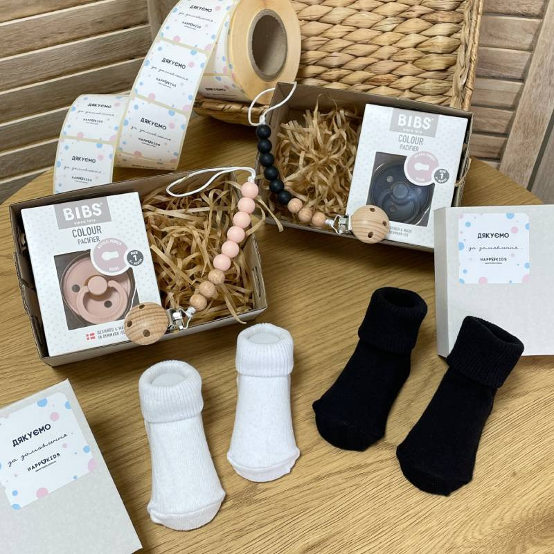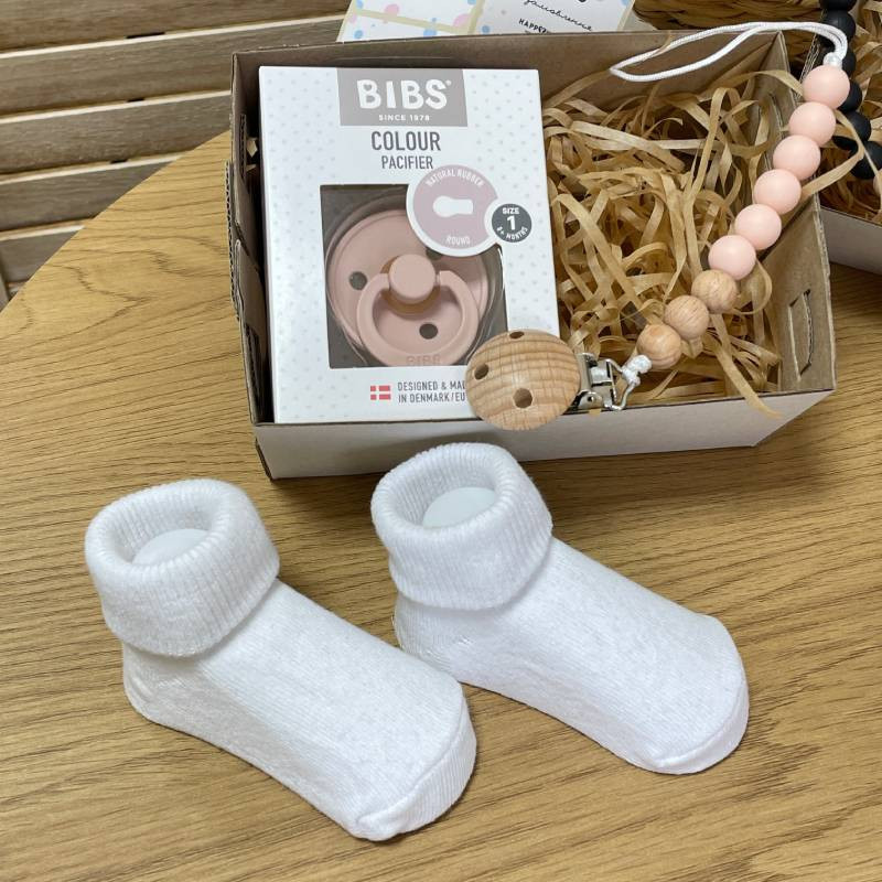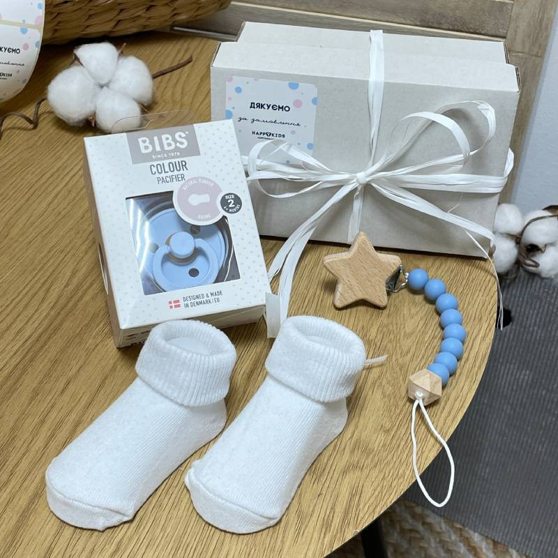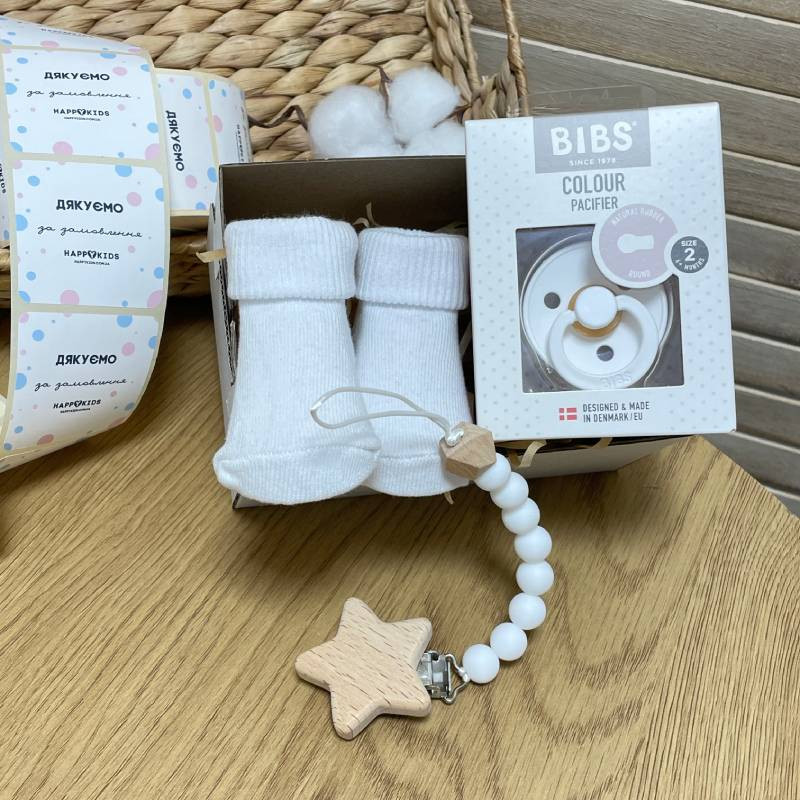 Подарочный бокс новорожденному пустышка, держатель, носки