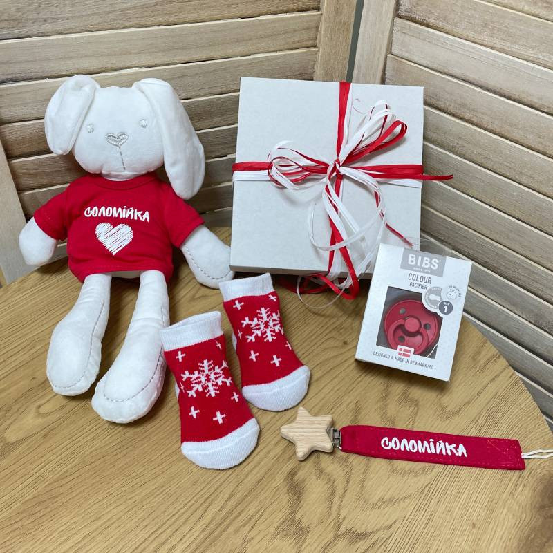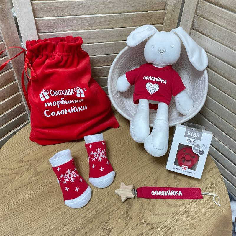 По желанию вы можете добавить игрушку зайчика с именем ребенка и выбрать подарочную упаковку.