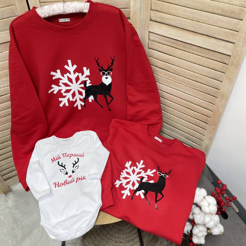 Семейный комплект из свитшотов и боди с новогодними оленями – стильный family look для праздников и зимних фотосессий. Такой комплект – отличная идея для семейного подарка и создания праздничного настроения.