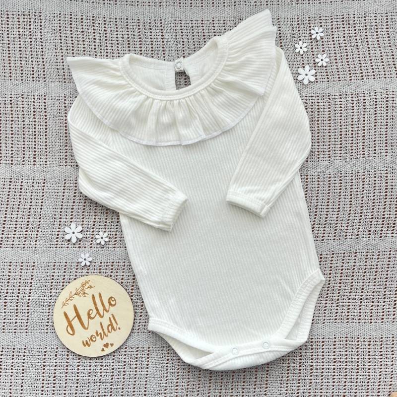 - Дизайн: классический крой боди с длинным рукавом. Элегантная рюша придает нежность и изысканность образу. Застежка на кнопках снизу для удобной переодевания или смены подгузника.