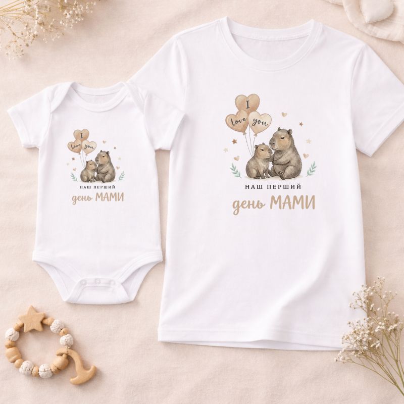 Дизайн: ніжний тематичний принт із капібарою та написом «Наш перший День Мами»; гармонійне поєднання кольорів для стильного family look.