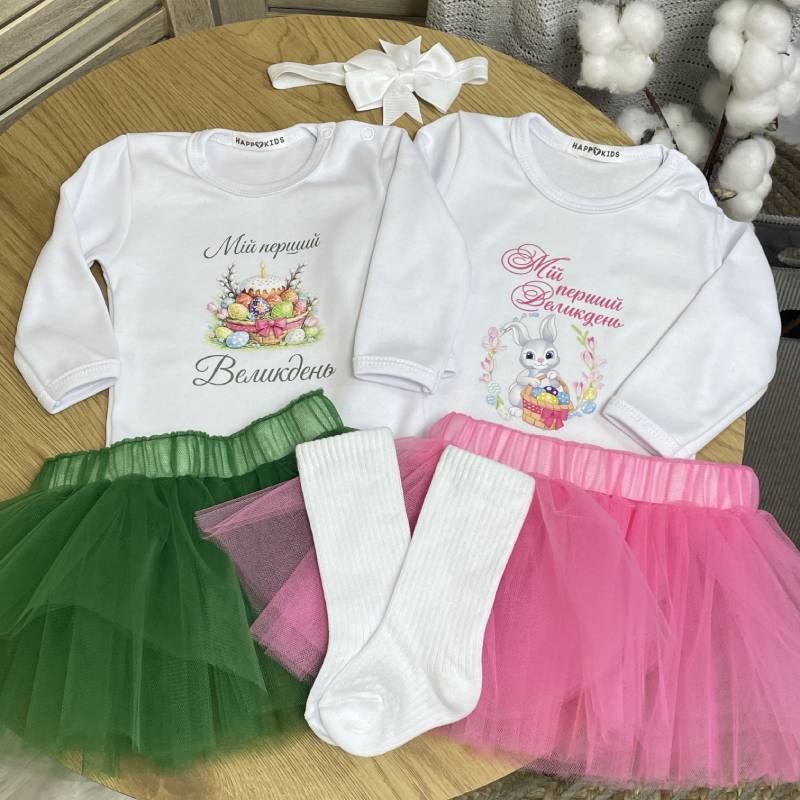 Дизайн: святковий боді з написом «Мій перший Великдень», доповнений тематичними елементами у світлих пастельних відтінках.
