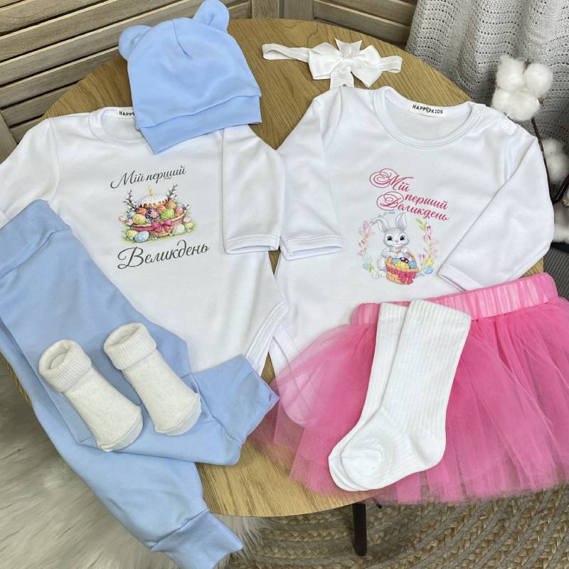 Переваги: ідеальний комплект для фотосесії новонародженого на Великдень, м’яка тканина, що не подразнює шкіру, зручний крій для легкого переодягання, стильний великодній одяг для немовлят.