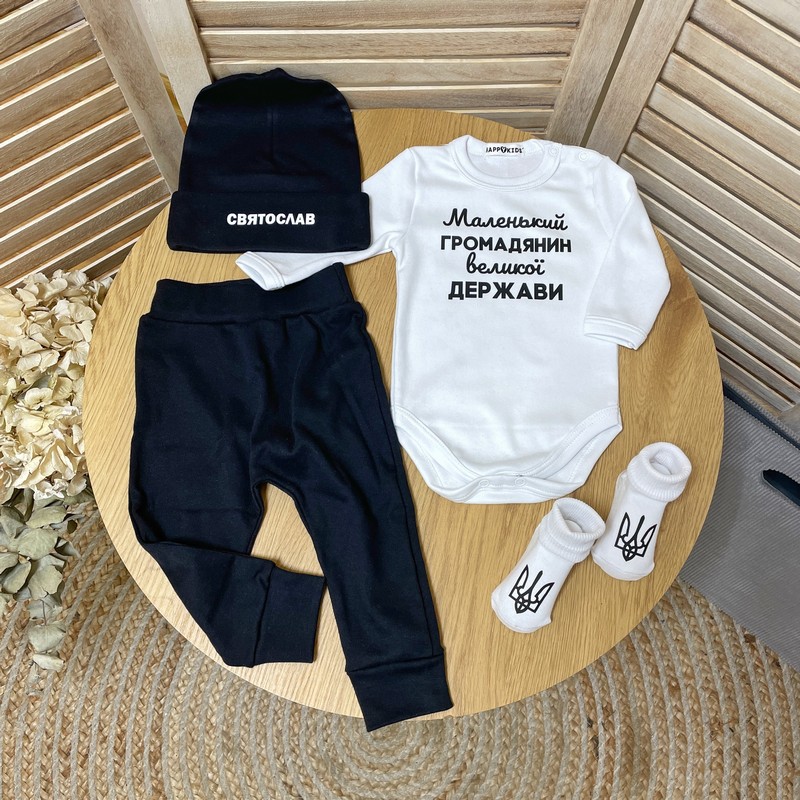 Якісні боді з принтом для маленьких чудово доповнюються штанами, шапочкою та патріотичними шкарпетками.