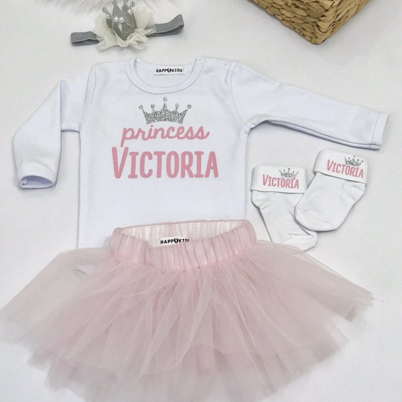 Оригінальний боді з іменем маленької принцеси з блискучим написом на перший день народження стане оригінальним та стильним на день народження донечки, ідеально пасує для домашньої фотосесії та святкувань.