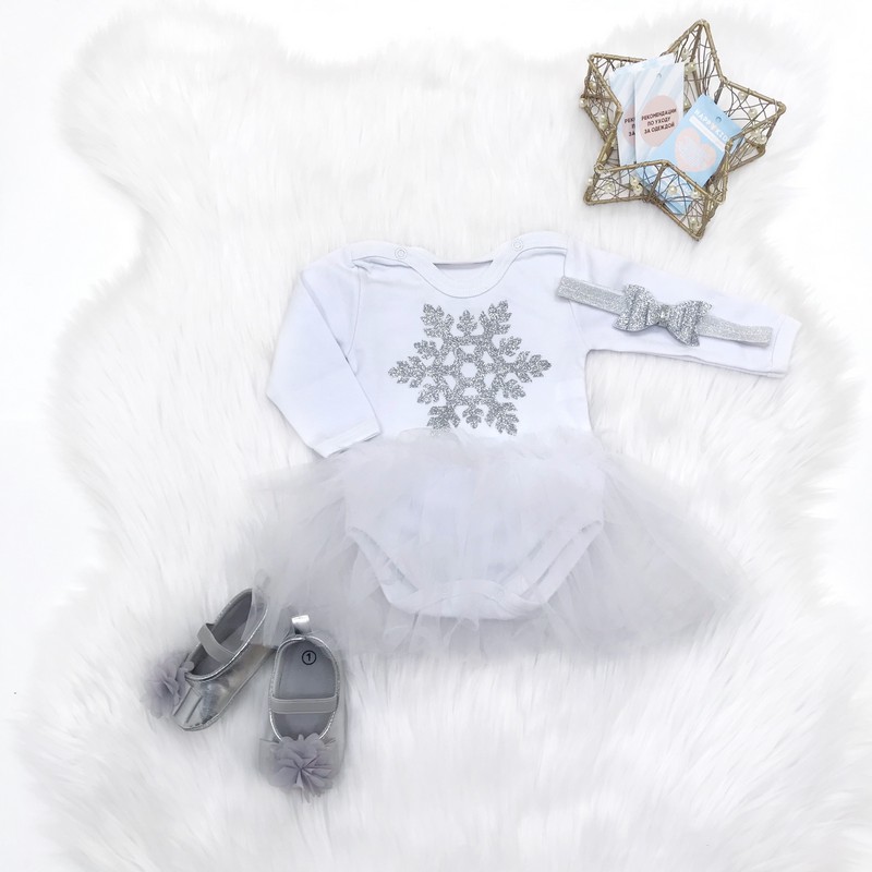 Наша новорічна Боді-сукня з фатином для дівчинки "Сніжинка" гліттер - це те, що зробить вашу маленьку красуню справжньою зіркою на будь-якому новорічному святі.