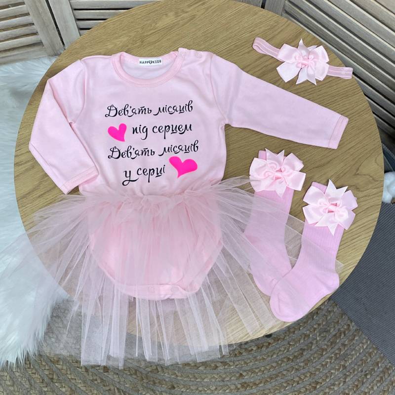 Дизайн: білий колір, зворушливий напис «9 місяців під сердцем, 9 місяців у серці», повітряна фатинова спідничка для святкового образу