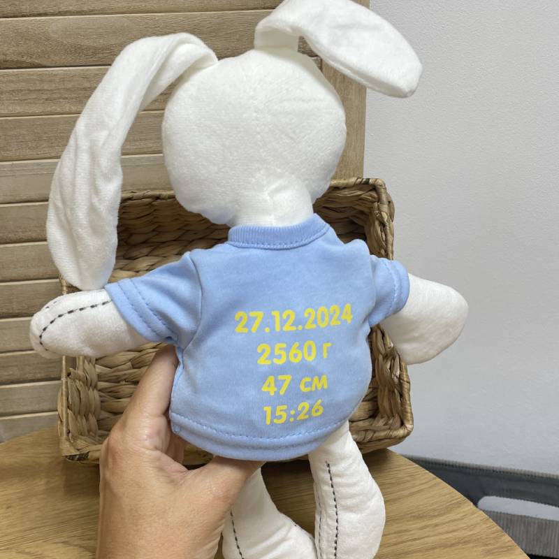На спинці футболки зайчика можна вписати дані народження дитини, які залишаться в пам'яті на все життя.