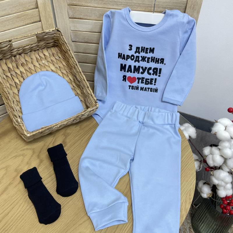 Дизайн: іменний боді з написом «З Днем народження, мамуся!» виконаний друкованим шрифтом; можливість додати ім’я дитини.